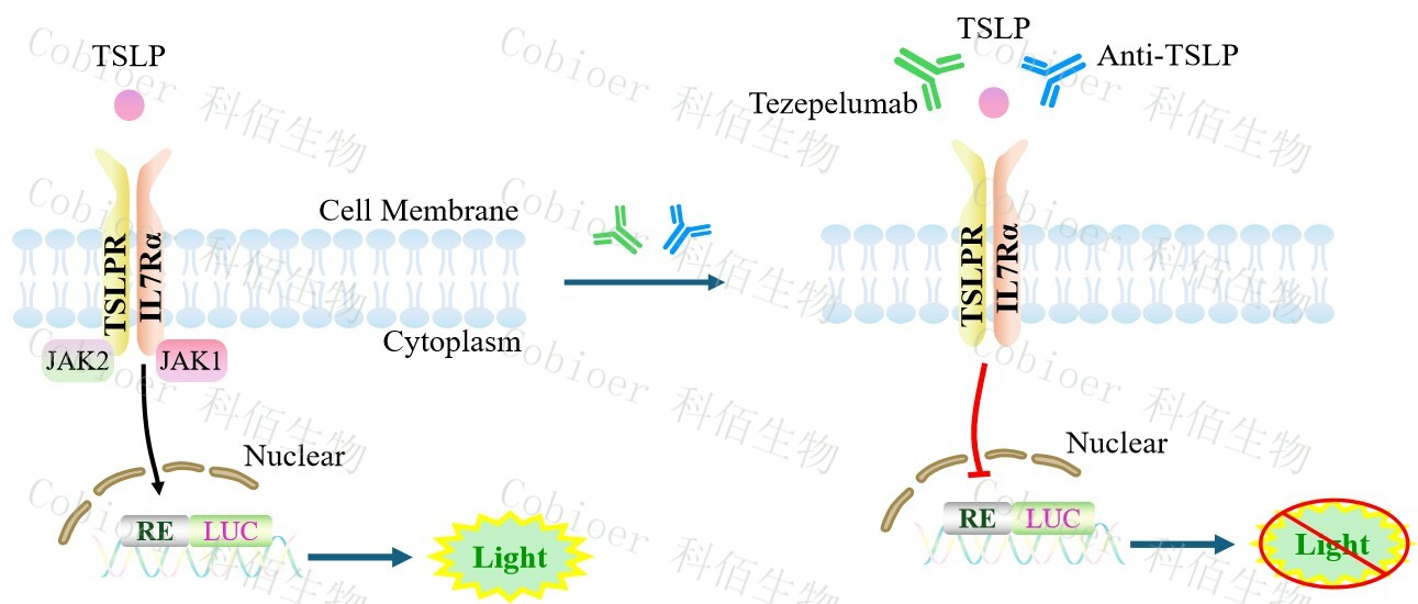 TSLP Effector Reporter Cell 報告基因藥靶模型很好的模擬了體內(nèi) TSLP 的信號轉(zhuǎn)導(dǎo)過程,原理見下圖所示。![]() Figure 1. TSLP Effector Reporter Cell 細胞模型原理圖 |