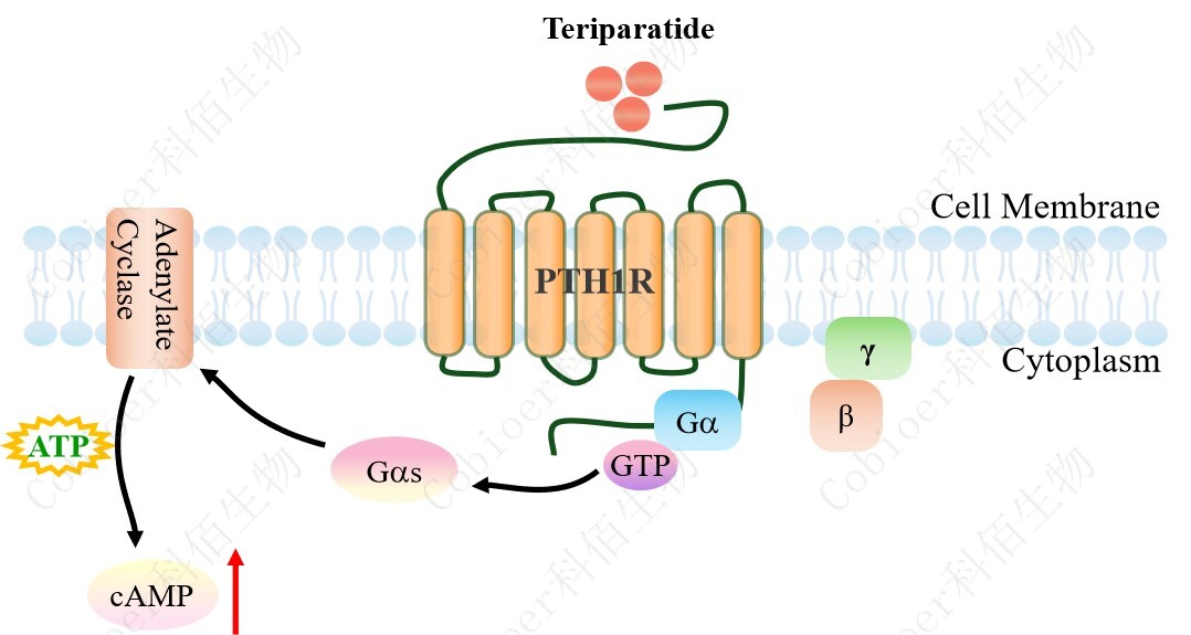 Ⅰ型甲狀旁腺激素受體 (PTH1R) 是一種 G 蛋白偶聯(lián)七跨膜受體 (GPCR),是內(nèi)源性PTH 和 PTH 相關(guān)蛋白 (PTHrP) 配體的主要功能性受體。PTH1R 在調(diào)節(jié)鈣代謝、骨骼發(fā)育和體內(nèi)平衡方面起著關(guān)鍵作用。PTH1R 受體由三個功能域組成。N 末端胞外結(jié)構(gòu)域負(fù)責(zé)識別和結(jié)合配體。七個跨膜螺旋的中間結(jié)構(gòu)域傳遞激素結(jié)合信號并與 G 蛋白相互作用。C 末端胞內(nèi)結(jié)構(gòu)域接收信號,隨后與 G 蛋白相互作用,激活下游信號通路。當(dāng)配體與 PTH1R結(jié)合時,會誘導(dǎo)受體構(gòu)象變化,從而激活多種下游信號轉(zhuǎn)導(dǎo)通路,這些通路可通過 G 蛋白依賴性或 G 蛋白非依賴性/β-Arrestin 機制激活。