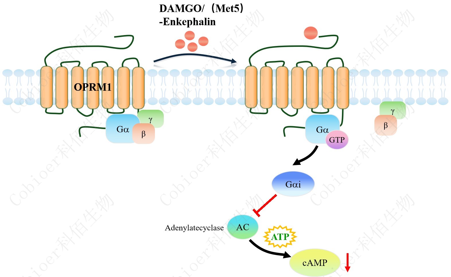 cAMP 在 G 蛋白偶聯(lián)受體(GPCR)信號(hào)轉(zhuǎn)導(dǎo)中是一種關(guān)鍵的第二信使。當(dāng)配體結(jié)合到 GPCR,構(gòu)象發(fā)生變化,激活受體接著激活 G 蛋白,Gi 的激活導(dǎo)致腺苷酸環(huán)化酶調(diào)控 cAMP 的下調(diào)。OPRM1 CHO 藥靶模型很好的模擬了體內(nèi) OPRM1 的信號(hào)轉(zhuǎn)導(dǎo)過(guò)程,原理見(jiàn) 下圖所示。 |