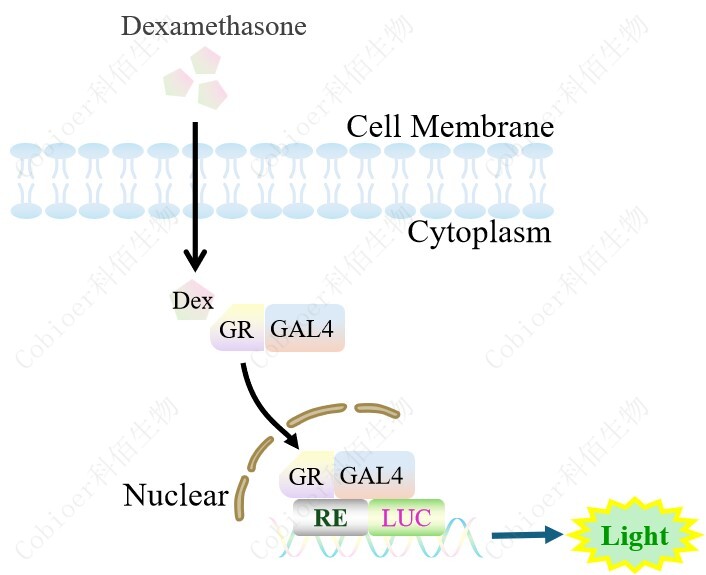 由 GR-GAL4 調 控并表達 Luc 熒光素酶報告基因的 HEK293 細胞。Dexamethasone (Hexadecadrol,地塞米 松)是糖皮質激素受體 (Glucocorticoid Receptor)激動劑、凋亡誘導劑,原理見下圖所示。![]() Figure 1. GR-GAL4 Luciferase Reporter HEK293 細胞原理示意圖 |