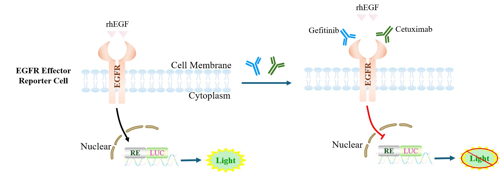 EGFR Effector Reporter Cell 報(bào)告基因藥靶模型很好的模擬了體內(nèi) EGFR 的信號(hào)轉(zhuǎn)導(dǎo)過程, 原理見下圖所示。