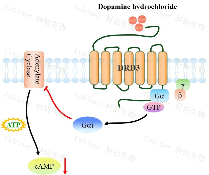 | 多巴胺(DA)是一種主要的兒茶酚胺神經(jīng)遞質(zhì),它與多巴胺受體(DRs)結(jié)合,因此 在中樞神經(jīng)系統(tǒng)(CNS)中起著重要作用,包括睡眠、工作記憶、情緒、學習等。DRs 是 由 DRD1、DRD2、DRD3、DRD4 和 DRD5 組成的 G 蛋白偶聯(lián)受體,根據(jù)它們對腺苷酸環(huán) 化酶(AC)活性的不同調(diào)節(jié)作用,分為 D1 樣受體(DRD1 和 DRD5)和 D2 樣受體(DRD 2、DRD3 和 DRD4)。 D2 樣受體與 Go 和 Gi 蛋白偶聯(lián),它們參與 AC 的失活,導致胞質(zhì)內(nèi) cAMP 水平降低。 DA 與 D2 樣受體的結(jié)合抑制 cAMP/PKA 信號通路,最終影響 CREB 磷酸化。DRD3 主要分 布于中樞神經(jīng)系統(tǒng)的邊緣區(qū)域,調(diào)控情緒及運動功能,是精神分裂癥、藥物成癮及帕金森 病的重要治療靶點。 | |