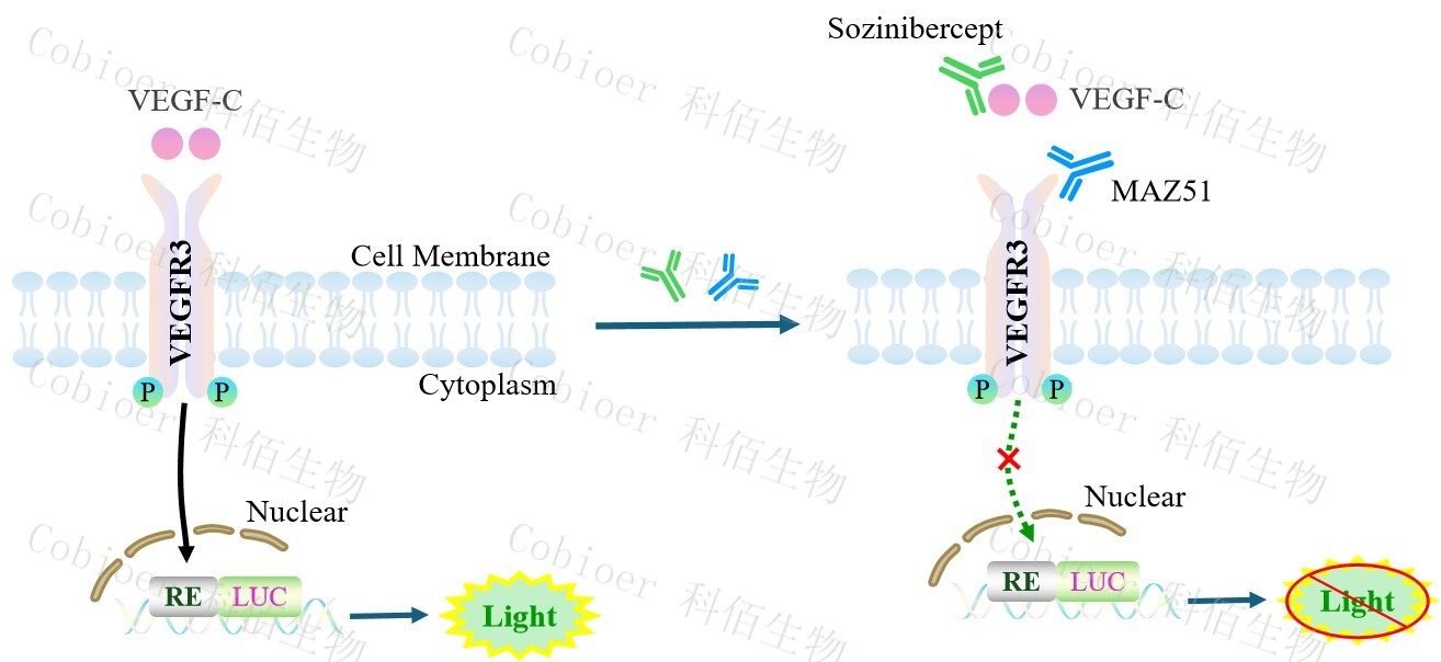 VEGFC/VEGFR3 Effector Reporter Cell 報告基因藥靶模型很好的模擬了體內(nèi) VEGFC/VEGFR3 的信號轉(zhuǎn)導(dǎo)過程,原理見下圖所示。![]() Figure 1. VEGFC/VEGFR3 Effector Reporter Cell 細胞模型原理圖 |