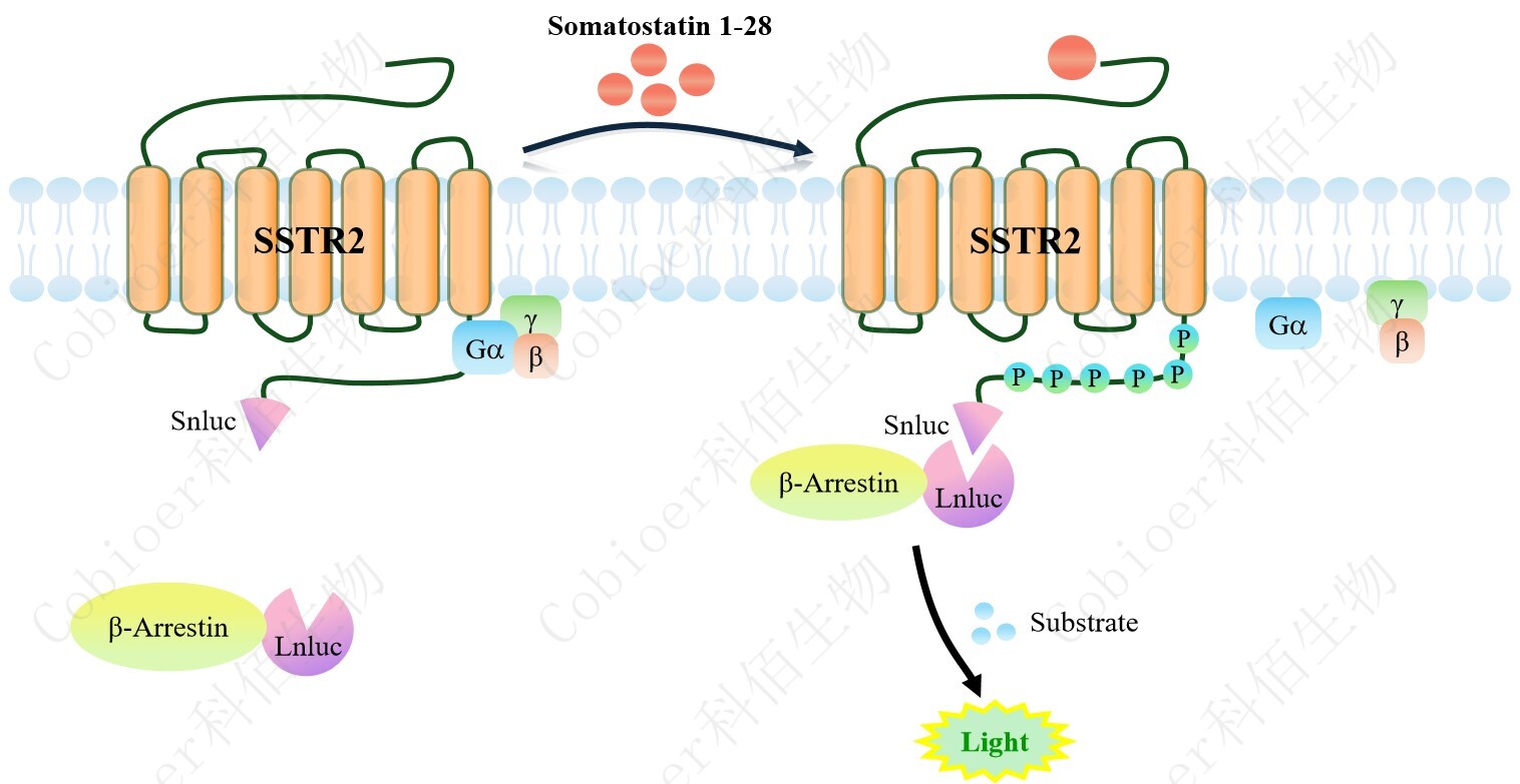 SSTR2 β-Arrestin CHO 報告基因藥靶模型很好的模擬了體內(nèi) SSTR2/β-Arrestin 的信號 轉(zhuǎn)導(dǎo)過程,原理見下圖所示。當缺乏配體刺激時,β-Arrestin 不與 SSTR2 結(jié)合,融合β- Arrestin 的熒光素酶處于失活構(gòu)象,當 SSTR2 遭遇配體刺激時,融合熒光素酶報告基因的 β-Arrestin 被招募,使熒光素酶報告基因處于激活狀態(tài),加入其底物后發(fā)光信號增強。