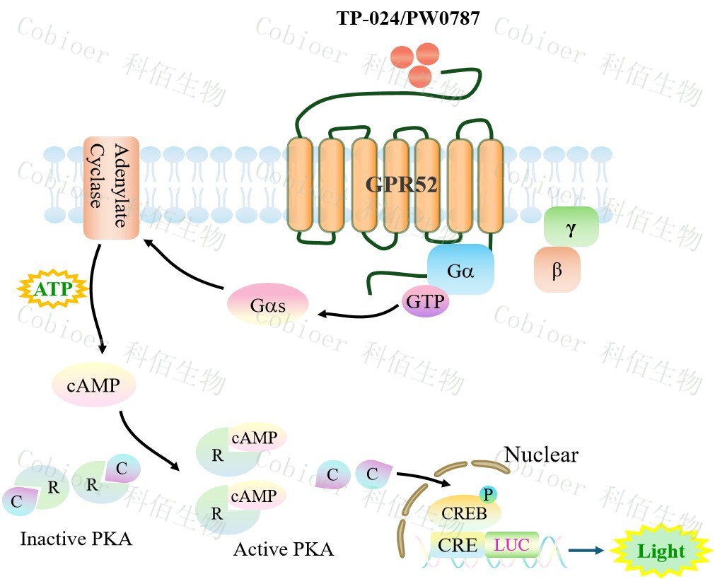 GPR52 CRE-Luc CHO 報(bào)告基因藥靶模型很好的模擬了體內(nèi) GPR52 的信號轉(zhuǎn)導(dǎo)過程, 原理見下圖所示。![]() Figure 1. GPR52 CRE-Luc CHO 細(xì)胞模型原理圖 |