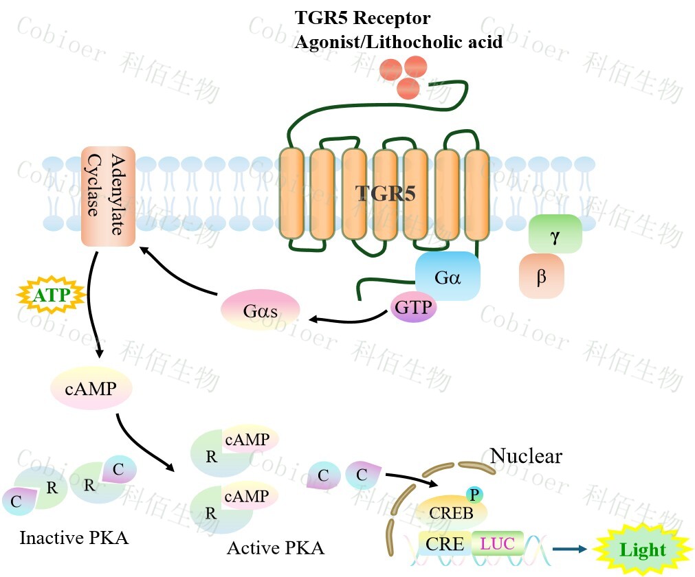 GPBAR1(TGR5) CRE-Luc HEK293 報(bào)告基因藥靶模型很好的模擬了體內(nèi) GPBAR1(TGR5) 的信號(hào)轉(zhuǎn)導(dǎo)過(guò)程,原理見(jiàn)下圖所示。