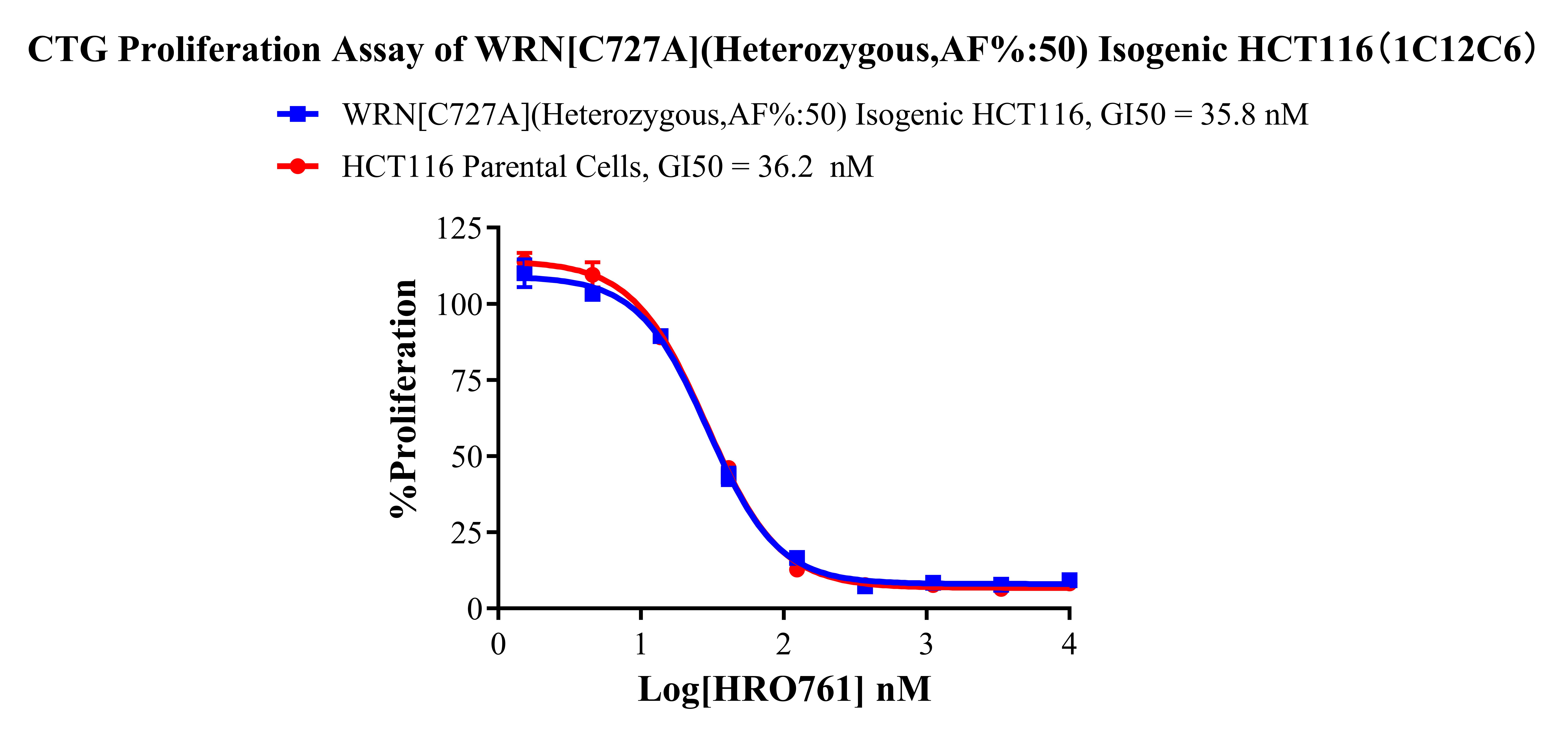 Figure 2. Sanger of WRN[C727A](Heterozygous,AF%:50) Isogenic HCT116![]() Figure 3. A:HCT116 Parental Cell;B:WRN[C727A](Heterozygous,AF%:50) Isogenic HCT116 通道2 藍(lán)色微滴代表WRN[C727A]突變陽性,通道2 綠色微滴代表該位點(diǎn)為陰性野生型 ![]() Figure 4. CTG Proliferation Assay of WRN[C727A](Heterozygous,AF%:50) Isogenic HCT116(1C12C6). ![]() Figure 5. CTC Proliferation Assay of WRN[C727A](Heterozygous,AF%:50) lsogenic HCT116(1C12C6). |