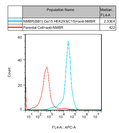 NMBR(BB1) Gα15 HEK293 細胞藥靶模型很好的模擬了體內(nèi) NMBR(BB1)&Gα15 的信號轉(zhuǎn)導過程,原理見下圖所示。![]() Figure 1. NMBR(BB1) Gα15 HEK293 細胞模型原理圖 |