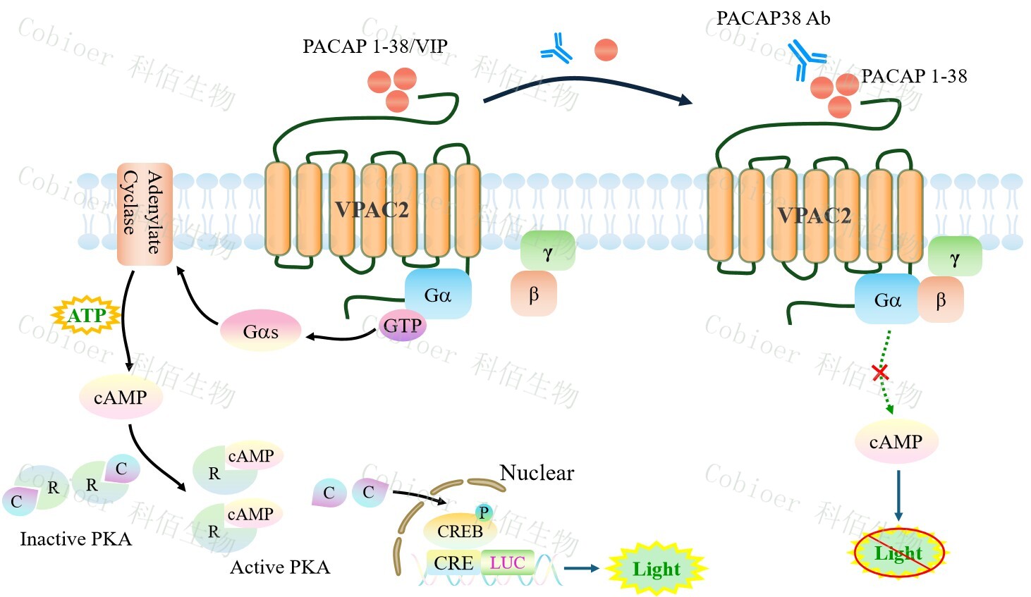 VPAC2 CRE-Luc CHO 報(bào)告基因藥靶模型很好的模擬了體內(nèi) VPAC2 的信號(hào)轉(zhuǎn)導(dǎo)過程, 原理見下圖所示。![]() Figure 1. VPAC2 CRE-Luc CHO 細(xì)胞模型原理圖 |