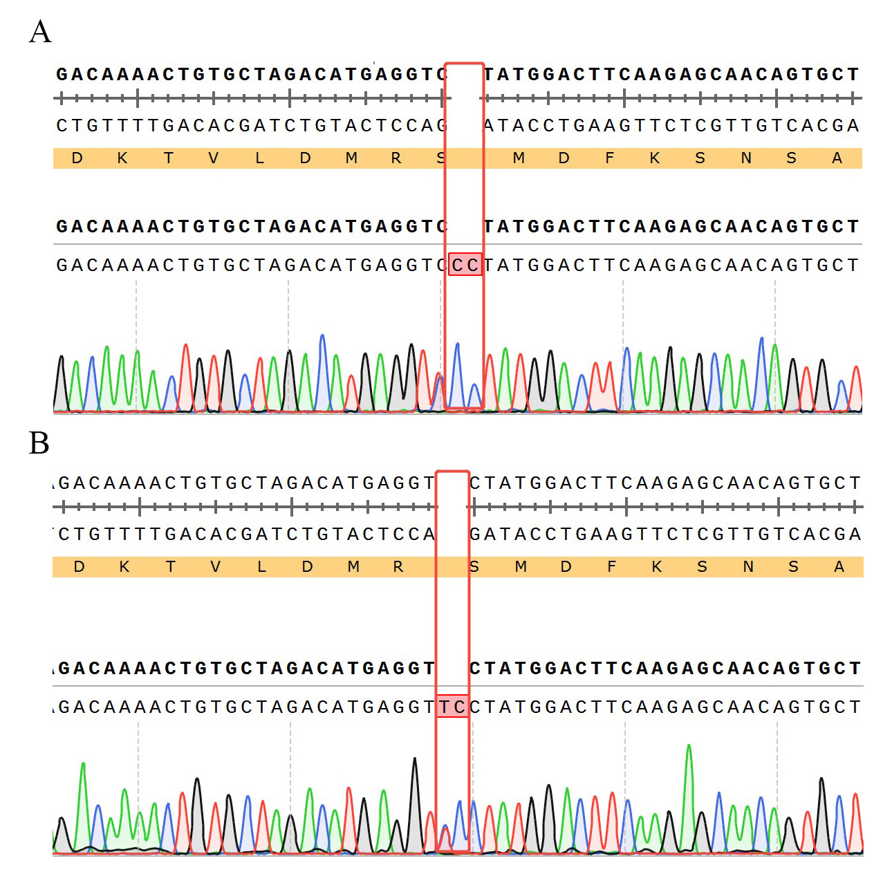 ![]() Figure 6. TRBC1 KO 的測(cè)序結(jié)果 A:chr7-142791898-TCA-C (TRBC1:p.L68Pfs*2)