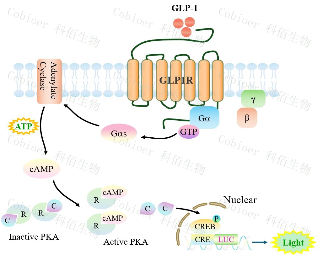 GLP1R CRE-Luc BHK 報(bào)告基因藥靶模型很好的模擬了體內(nèi) GLP1R 的信號(hào)轉(zhuǎn)導(dǎo)過程, 原理見下圖所示。