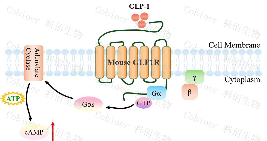 | cAMP cAMP 在 G 蛋白偶聯(lián)受體(GPCR)信號(hào)轉(zhuǎn)導(dǎo)中是一種關(guān)鍵的第二信使。當(dāng)配體結(jié)合到 GPCR,構(gòu)象發(fā)生變化,激活受體接著激活 G 蛋白,Gs 的激活導(dǎo)致腺苷酸環(huán)化酶調(diào)控 cAMP 的升高。 GLP1R 藥靶模型很好的模擬了體內(nèi) GLP1R 的信號(hào)轉(zhuǎn)導(dǎo)過(guò)程,原理見(jiàn)下圖所示。 ![]() Figure 1. Mouse GLP1R CHO 細(xì)胞模型原理圖 |