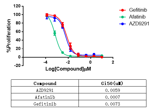Figure 4. Anti-proliferation assay of three reference compounds on the EGFR Del19/BaF3 Stable Cell Line. |
