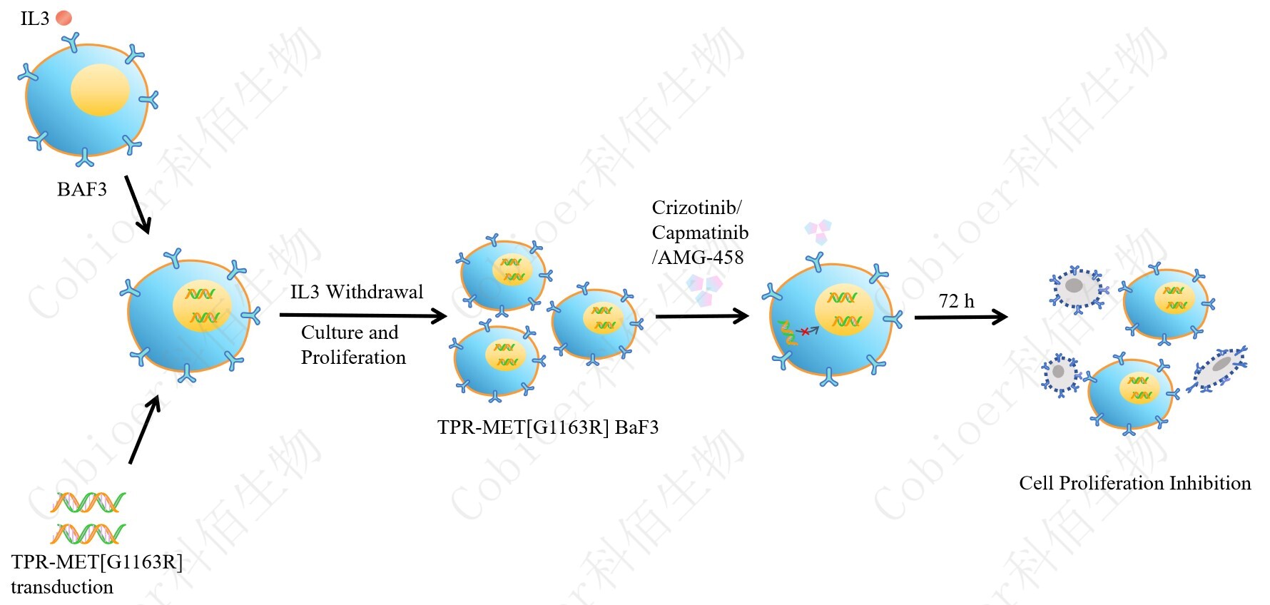 BaF3(小鼠原 B 細(xì)胞)的生長和增殖需要 IL-3 的維持。通過引入各種表達(dá)激酶的基因, 能作為 BaF3 的驅(qū)動基因,讓 BaF3 不再依賴 IL-3 而增殖,進(jìn)而激酶基因成為 BaF3 增殖依 賴的驅(qū)動基因,用于評估小分子藥物對激酶的靶向抑制作用,原理及流程見下圖所示。![]() Figure 1. TPR-MET[G1163R] BaF3 細(xì)胞的構(gòu)建原理圖 |