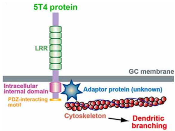 人類和小鼠的5T4蛋白的同源性可達81%。大量的證據(jù)顯示5T4與不同的生理、病理過程密切相關,如細胞間連接、細胞形態(tài)及運動、細胞黏附能力、細胞膜的完整性等等。5T4廣泛表達于胚胎發(fā)育期的各種滋養(yǎng)層細胞,但在正常成人組織中表達極少,只在幾種上皮細胞中表達,但卻在很多癌癥細胞中有表達,包括結腸癌、胃癌、卵巢癌、口腔癌、前列腺癌、肺癌、腎癌、子宮癌等。這一特點使其成為了一種有吸引力的腫瘤免疫治療新靶點。
