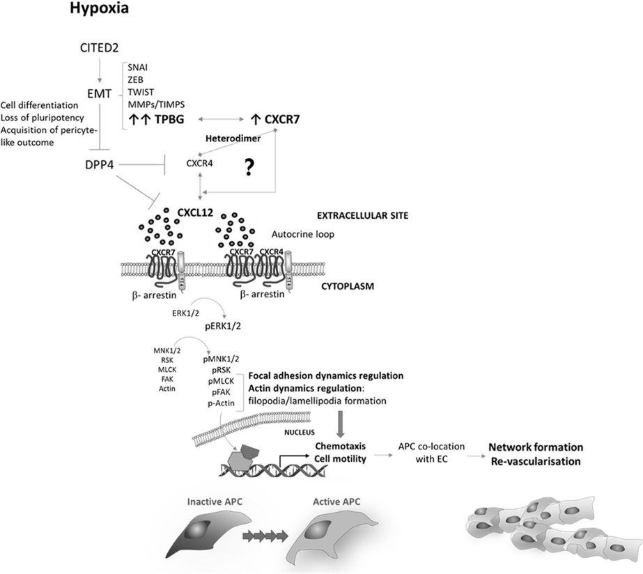 CXCL12和CXCR4表達與許多腫瘤的發(fā)生有關,有研究表明CXCR4的表達有助于癌細胞擴散到CXCL12高表達的組織中,比如肺、肝、淋巴結和骨髓。在小鼠胚胎干細胞、成纖維細胞和癌細胞中,TPBG的上調與CXCL12的誘導有關。TPBG通過抑制負責CXCL12裂解的蛋白酶DPP4來延長CXCL12的生物利用度。CXCL12通過結合CXCR4以及非典型CXCR7和CXCR4/CXCR7異源二聚體觸發(fā)細胞內信號傳導。CXCR4和CXCR7也可以與β-arrestin-2形成復合物,從而促進受體內化并將信號重定向到其他不依賴G蛋白的途徑如p38 MAPK/ERK 信號通路。在某種程度上說明5T4可通過CXCR4/CXCL12通路來影響腫瘤細胞的發(fā)生、發(fā)展、轉移等。
