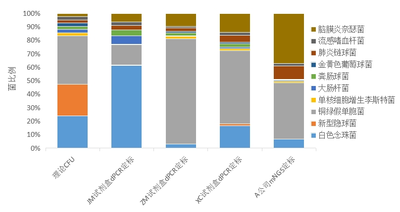 同時,我們也對此產(chǎn)品進(jìn)行了mNGS的檢測,在無差別檢測比對得到的數(shù)據(jù)中,10個菌都可以檢出,但是比例與數(shù)字PCR也有同樣的差異。