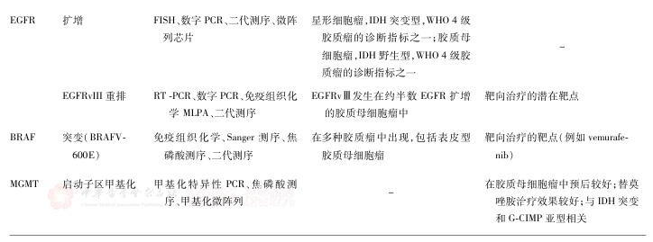 腦膠質(zhì)瘤確診需通過(guò)腫瘤切除術(shù)或活組織檢查術(shù)獲取標(biāo)本,進(jìn)行組織病理學(xué)和分子病理學(xué)整合診斷,以確定病理分級(jí)和分子亞型。分子標(biāo)志物對(duì)腦膠質(zhì)瘤的個(gè)體化治療及臨床預(yù)后判斷具有重要意義。