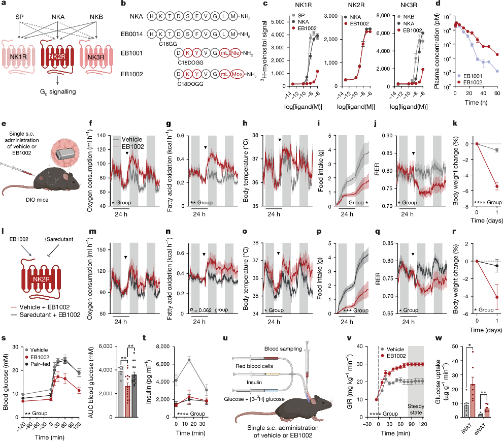 在文章研究部分,科研人員對(duì)肥胖模型小鼠注射了一種NK2R的天然配體激動(dòng)劑后發(fā)現(xiàn)這些肥胖小鼠體重在短期明顯下降,分析結(jié)果表明小鼠的能量消耗顯著增加,食物攝入下降約20%,且該代謝效應(yīng)并不依賴于瘦素(Leptin)信號(hào)通路。此外,科研人員發(fā)現(xiàn)優(yōu)化后的NK2R激動(dòng)劑EB1002不僅使小鼠在單次注射后的7天內(nèi)體重持續(xù)下降約15%,還能提高小鼠對(duì)胰島素的敏感性,促進(jìn)白色脂肪組織攝取葡萄糖,且能激活下丘腦弓狀核和室旁核神經(jīng)元來抑制因瘦素或黑皮質(zhì)素4受體缺失引起的高食欲狀態(tài)。這個(gè)結(jié)果表明該靶點(diǎn)可能在抗肥胖領(lǐng)域中,遠(yuǎn)比合并糖尿病的肥胖具有更廣泛的應(yīng)用前景。