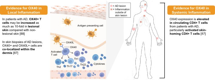 有研究證明OX40通路的激活參與了AD患者的全身和局部炎癥(如下圖所示)。雖然OX40L的表達(dá)(主要是單核細(xì)胞)在AD患者和健康對(duì)照組之間沒(méi)有差異,但在AD患者循環(huán)CD4+ T細(xì)胞中OX40的表達(dá)升高。在AD患者的外周血中,活化的CD4+ T細(xì)胞上OX40的表達(dá)比未表達(dá)抗原的活化CD4+ T細(xì)胞上OX40的表達(dá)增加。AD患者病變皮膚中OX40+細(xì)胞(可能是T細(xì)胞)和OX40L+樹突狀細(xì)胞的數(shù)量比銀屑病和非病變皮膚多。一項(xiàng)研究表明,在AD患者中,皮損皮膚中OX40+ T細(xì)胞比非皮損皮膚增加了10倍之多。在AD病變的皮膚活檢中,發(fā)現(xiàn)OX40+真皮細(xì)胞和OX40L+細(xì)胞(可能是肥大細(xì)胞)在真皮內(nèi)共定位,在角質(zhì)形成細(xì)胞上可見OX40L的表達(dá),提示OX40信號(hào)的局部活性。