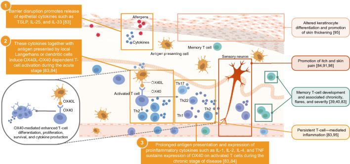 雖然目前對(duì)特應(yīng)性皮炎(AD)的具體情況知之甚少,但OX40可能在特應(yīng)性皮炎(AD)發(fā)展的幾個(gè)階段都很重要。在特應(yīng)性皮炎(AD)的急性期,OX40信號(hào)可能參與了Th2型 T細(xì)胞驅(qū)動(dòng)的炎癥,放大了皮膚屏障的破壞和瘙癢等癥狀的發(fā)展。在早期發(fā)病過(guò)程中,朗格漢斯細(xì)胞和炎性樹突狀表皮細(xì)胞識(shí)別通過(guò)被破壞的表皮屏障穿透皮膚的外來(lái)抗原,隨后啟動(dòng)Th2細(xì)胞。屏障破壞的角質(zhì)形成細(xì)胞也可以產(chǎn)生細(xì)胞因子,如胸腺基質(zhì)淋巴生成素(TSLP)、IL-25和IL-33。由于這些分子已被證明可以刺激APC表達(dá)OX40L,這可以通過(guò)增強(qiáng)傳遞給T細(xì)胞的OX40信號(hào)來(lái)進(jìn)一步增強(qiáng)T細(xì)胞的擴(kuò)增和分化。同樣,OX40L也被發(fā)現(xiàn)可以誘導(dǎo)ILC2,而ILC2也受這些先天細(xì)胞因子的調(diào)節(jié),ILC2和T細(xì)胞之間涉及OX40L和OX40的相互作用也可能有助于Th2細(xì)胞的初始啟動(dòng)。激活的Th2細(xì)胞上調(diào)IL-14、IL-13和IL-31的產(chǎn)生,進(jìn)而通過(guò)抑制屏障相關(guān)基因(如角化細(xì)胞終末分化基因聚絲蛋白)的表達(dá)破壞表皮屏障功能,促進(jìn)表皮增生。IL-4和IL-13結(jié)合在T細(xì)胞、B細(xì)胞、巨噬細(xì)胞和其他免疫細(xì)胞上表達(dá)的IL-4Rα,促進(jìn)炎癥和免疫球蛋白E類轉(zhuǎn)換。感覺(jué)神經(jīng)元表達(dá)皮膚細(xì)胞和免疫細(xì)胞釋放的各種細(xì)胞因子的受體,包括IL-4、IL-13、IL-31和TSLP,將瘙癢和疼痛信號(hào)傳遞到中樞神經(jīng)系統(tǒng),引起特應(yīng)性瘙癢、疼痛和抓撓。