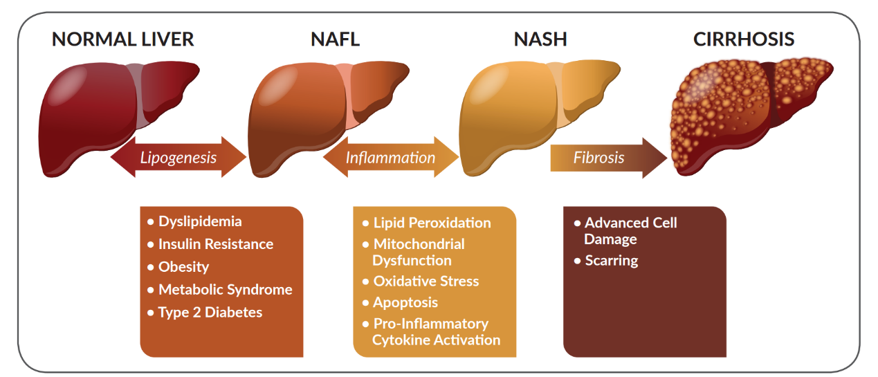 非酒精性脂肪性肝炎(NASH)是非酒精性脂肪肝?。∟AFLD)的嚴(yán)重形式,伴隨肝臟炎癥、脂肪堆積和纖維化,可進(jìn)展為肝硬化甚至肝癌。全球約 25% 成人患有非酒精性脂肪肝?。∟AFLD),其中20%-30% 會(huì)進(jìn)展為非酒精性脂肪性肝炎(NASH)