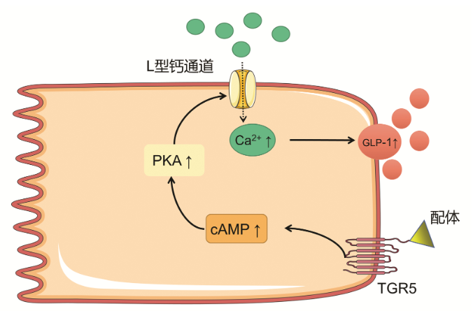 TGR5在維持葡萄糖穩(wěn)態(tài)和胰島素敏感性方面上的效果已得到廣泛證明。例如,使用TGR5激動(dòng)劑6α-乙基-23(S)-甲基-膽酸(6α-ethyl-23(S)-methyl-cholic acid,INT-777)可以提高肥胖小鼠的胰島素敏感性,7-硫酸膽酸以TGR5依賴性方式增加胰島素抵抗小鼠的葡萄糖耐量等。機(jī)體各組織的TGR5可通過(guò)不同的分子機(jī)制參與血糖代謝的調(diào)節(jié)。TGR5對(duì)于血糖代謝的作用,主要與腸促胰島素釋放相關(guān),通過(guò)刺激腸內(nèi)分泌L細(xì)胞分泌GLP-1來(lái)實(shí)現(xiàn)。既往研究發(fā)現(xiàn),GLP-1可促進(jìn)胰島素分泌,促進(jìn)胰島β細(xì)胞存活和增殖,抑制細(xì)胞凋亡,并且可有效刺激2型糖尿病患者的胰島素分泌并降低血糖。早期觀點(diǎn)認(rèn)為TGR5被激活后刺激腸內(nèi)分泌L細(xì)胞內(nèi)cAMP水平增加,線粒體氧化磷酸化增加,ATP/ADP比例增加,導(dǎo)致ATP依賴性鉀離子通道(KATP)關(guān)閉,開放鈣離子通道,促進(jìn)鈣離子內(nèi)流,釋放GLP-1。但后續(xù)大量研究驗(yàn)證了GLP-1的分泌確實(shí)與cAMP升高,胞內(nèi)鈣離子升高有關(guān),但與ATP依賴性鉀離子通道無(wú)關(guān)。Brighton等的實(shí)驗(yàn)進(jìn)一步驗(yàn)證了GLP-1分泌與L細(xì)胞內(nèi)的cAMP和Ca2+濃度變化有關(guān),并且說(shuō)明了該作用主要由位于基底外側(cè)L細(xì)胞膜上的TGR5介導(dǎo)。近年來(lái),Goldspink等發(fā)現(xiàn)腸L細(xì)胞上的TGR5被激活后,通過(guò)cAMP/PKA途徑,開放了L型Ca2+通道,促進(jìn)Ca2+內(nèi)流,引發(fā)GLP-1分泌。