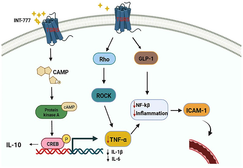 有報(bào)道稱,在慢性炎癥反應(yīng)中,TNF-α可激活多種半胱天冬酶,導(dǎo)致炎癥細(xì)胞凋亡。TGR5已被發(fā)現(xiàn)通過(guò)調(diào)節(jié)Rho/Rho相關(guān)蛋白激酶(ROCK)信號(hào)通路來(lái)調(diào)節(jié)TNF-α。作為TGR5的激動(dòng)劑,INT-777可以阻斷TNF-α誘導(dǎo)的RMEC增殖和遷移,抑制TNF-α促進(jìn)血管通透性的作用。此外,已有證據(jù)表明,TGR5激動(dòng)劑可以通過(guò)激活TGR5- camp蛋白激酶A (PKA)信號(hào)通路,上調(diào)IL-10的表達(dá),發(fā)揮抗炎和免疫抑制作用,降低促炎細(xì)胞因子IL-1β、IL-6和TNF-α的表達(dá)。有研究表明,GLP-1可通過(guò)抑制NF-κB延緩ECs的損傷,進(jìn)而抑制IL-1β、IL-6、TNF-α等炎癥因子的分泌。而各種研究證實(shí)GLP-1是TGR5的靶點(diǎn)之一;其分泌依賴于TGR5。因此,推測(cè)激活TGR5可能是刺激GLP-1分泌、延緩RMEC損傷的有效途徑。