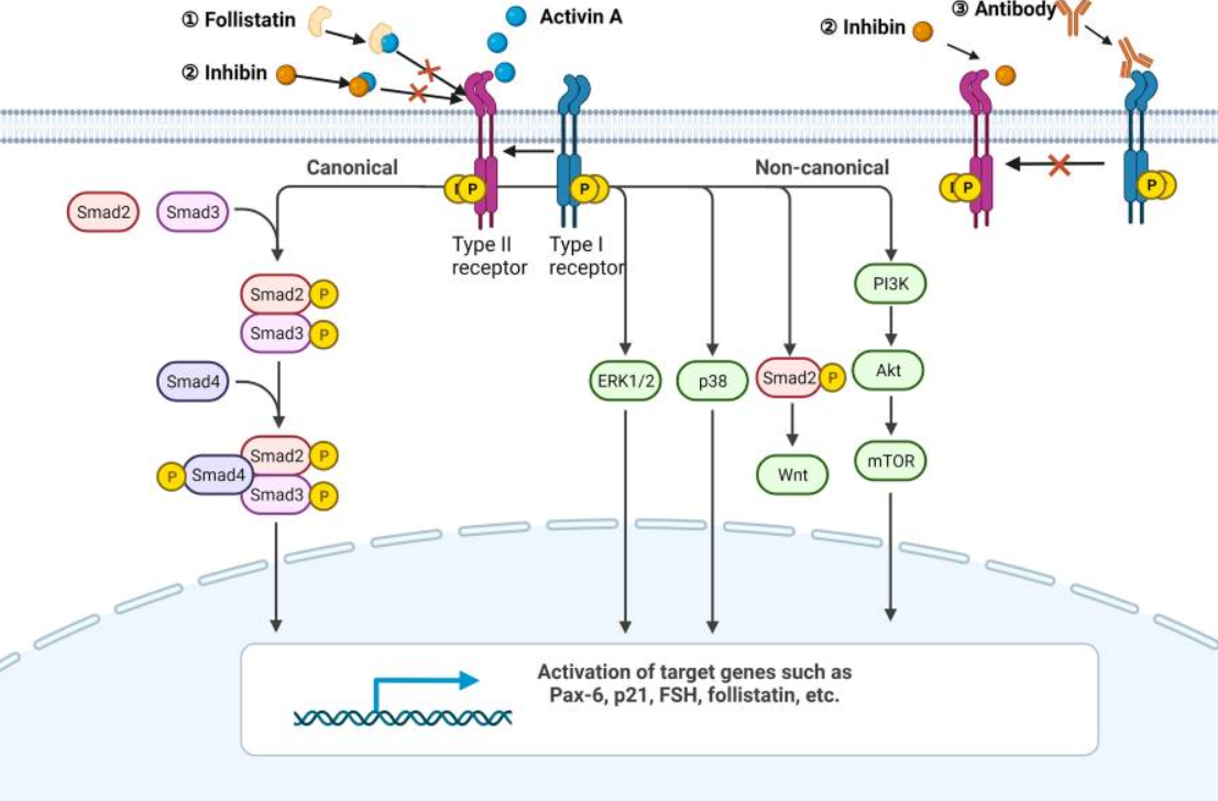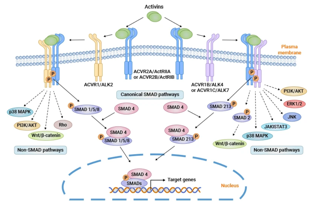激活素A首先結合并促進ActRII的磷酸化,然后招募I型受體形成磷酸化多聚體。激活的受體復合物磷酸化SMAD2 和 SMAD3蛋白,磷酸化后的smad2/3與smad4蛋白結合成三聚體并易位到細胞核中調控相關基因的轉錄。