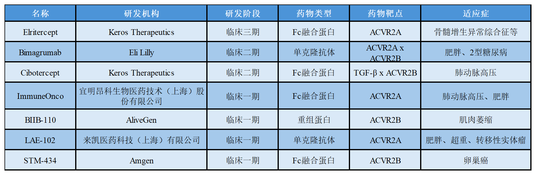 關于ActRⅡ在研的部分藥物進展如下表所示: