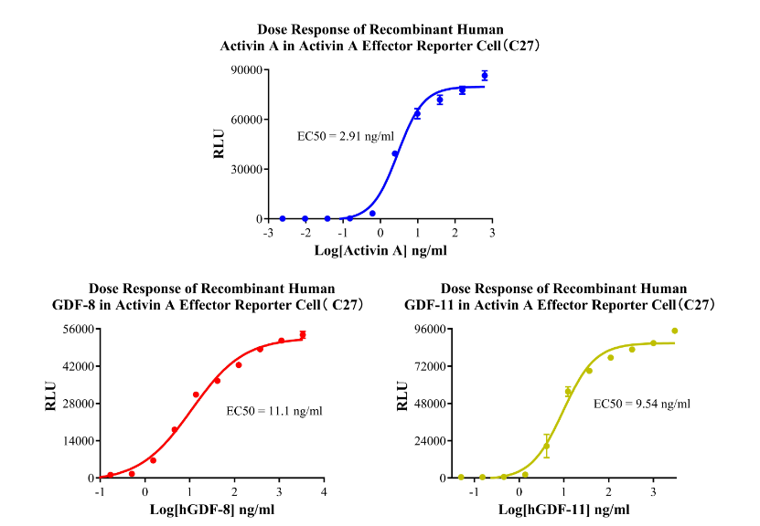 Figure 3.Dose Response of Recombinant Human Activin A in Activin A Effector Reporter Cell( C27).Dose Response of Recombinant Human GDF-8 in Activin A Effector Reporter Cell( C27).Dose Response of Recombinant Human GDF-11 in Activin A Effector Reporter Cell(C27).