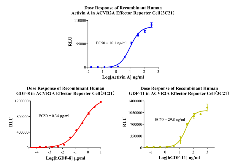 Figure 8. Dose Response of Recombinant Human Activin A in ACVR2A Effector Reporter Cell(3C21).Dose Response of Recombinant Human GDF-8 in ACVR2A Effector Reporter Cell (3C21). Dose Response of Recombinant Human GDF-11 in ACVR2A Effector Reporter Cell (3C21).