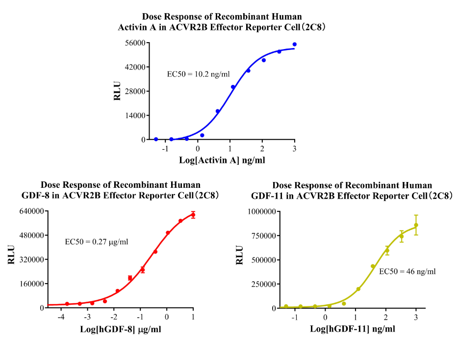 Figure 13.Dose Response of Recombinant Human Activin A  in ACVR2B Effector Cell(2C8).Dose Response of Recombinant Human GDF-8 in ACVR2B Effector Reporter Cell(2C8).Dose Response of Recombinant Human GDF-11 in ACVR2B Effector Reporter Cell (2C8).