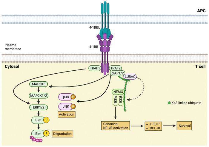 4-1BB的配體是4-1BBL(也稱為T(mén)NFSF9或CD137L)。4-1BBL是TNF超家族的II型膜蛋白。在與抗原呈遞細(xì)胞(APC)上的 4-1BBL 相互作用后,4-1BB 信號(hào)傳導(dǎo)首先將TRAF1和TRAF2與cIAP1和cIAP2一起募集到位于 4-1BB 細(xì)胞質(zhì)尾部的 TRAF 結(jié)合基序,形成 4-1BB 信號(hào)復(fù)合物。TRAF1 和 TRAF2 通過(guò) TRAF1 刺激 ERK1/2 活性導(dǎo)致 ERK1/2 激活。ERK1/2 的激活還誘導(dǎo)促細(xì)胞凋亡蛋白 Bim 的磷酸化,使Bim的蛋白酶體降解,進(jìn)而促進(jìn)了 T 細(xì)胞存活。在 4-1BB 誘導(dǎo)的 NF-κB 激活的背景下,TRAF2-cIAP 復(fù)合物啟動(dòng) NF-κB 通路。IKK 復(fù)合物由三個(gè)亞基組成:兩個(gè)激酶 IKKα 和 IKKβ,以及調(diào)節(jié)亞基 NF-κB 必需調(diào)節(jié)劑 (NEMO;也稱為 IKKγ)。NF-κB誘導(dǎo)BCL-XL、BCL-2和c-FLIP的轉(zhuǎn)錄,刺激IL-2、IL-4和IFN-γ的表達(dá),促進(jìn)T細(xì)胞的存活和細(xì)胞毒性活性。此外,TRAF2 募集促進(jìn) JNK 和 p38 MAPK 通路的激活。JNK 易位到細(xì)胞核中,與轉(zhuǎn)錄因子 JUN 和 ATF2 相互作用,導(dǎo)致 T 細(xì)胞產(chǎn)生 IL-2、IL-4 和 IFN-γ。
