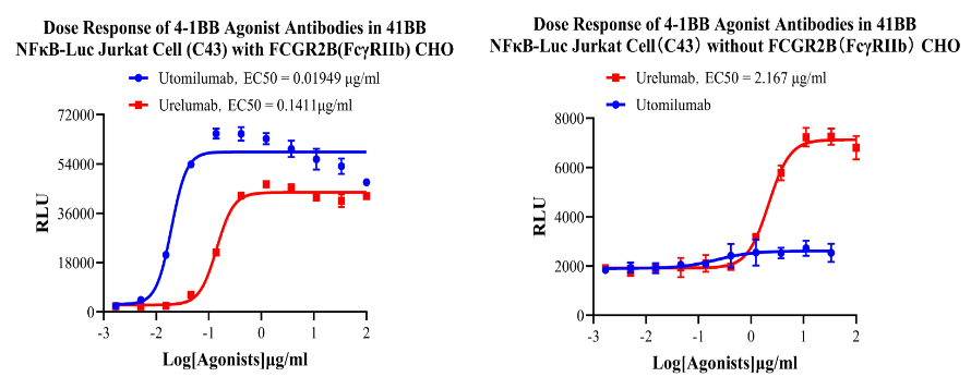 Figure 9. Dose Response of 4-1BB Agonist Antibodies in 41BB NFκB-Luc Jurkat Cell(C43) with/without FCGR2B(FcγRIIb) CHO.