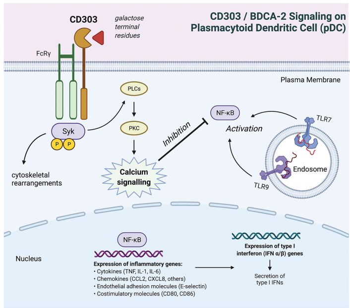 BDCA-2 (blood DC antigen 2血液樹(shù)突狀細(xì)胞抗原2)又叫CLEC4C或CD303,是人類(lèi)pDCs特有的II型c型凝集素受體(CLR),與TLR-7/9協(xié)同識(shí)別微生物和協(xié)調(diào)炎癥免疫反應(yīng)。BDCA-2是一種可溶性跨膜糖蛋白,由聚集在12號(hào)染色體上的c型凝集素編碼基因編碼,包括KLRG1和CLEC4A。與其他CLR類(lèi)似,BDCA-2具有單個(gè)胞外碳水化合物識(shí)別結(jié)構(gòu)域,并且在其短細(xì)胞質(zhì)尾部缺乏固有的信號(hào)基序。BDCA-2選擇性地與IgG分子上的半乳糖端聚糖結(jié)合,產(chǎn)生抗炎反應(yīng)來(lái)抵抗因?yàn)橥ㄟ^(guò)抗原吸收、內(nèi)化、呈遞給T細(xì)胞以及信號(hào)通路如IFN-I,NF-kB等其他炎性體激活。BDCA-2與跨膜區(qū)的FcRγ鏈形成adaptor,允許酪氨酸激酶募集磷酸化以及鈣動(dòng)員,類(lèi)似于b細(xì)胞受體(BCR)信號(hào)體,BDCA-2信號(hào)通過(guò)免疫受體酪氨酸激活發(fā)生基序(ITAM)介導(dǎo)的酪氨酸(Syk)磷酸化,磷脂酰肌醇特異性磷酯酶(PLCγ2),PKC的激活等誘導(dǎo)鈣流入并在pDC中充當(dāng)負(fù)調(diào)節(jié)劑,介導(dǎo)IFN-Ⅰ抑制并通過(guò)BDCA2觸發(fā)減少NFKB的激活。