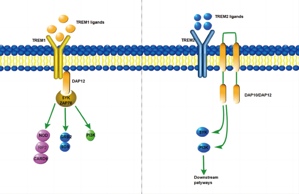 TREM(Triggering receptor expressed on myeloid cells)家族屬于細(xì)胞表面受體,介導(dǎo)調(diào)控炎癥反應(yīng)。TREM1屬于髓系細(xì)胞表面受體,在多種腫瘤微環(huán)境中均表達,協(xié)同經(jīng)典的模式識別受體(PRR),例如Toll-like受體(TLR)家族和Nod-like受體(NLR)家族,在宿主防御中放大由微生物成分介導(dǎo)的炎癥反應(yīng),具有抗腫瘤的作用。TREM2(Triggering receptor expressed on myeloid cells-2)是免疫球蛋白超家族的跨膜受體,僅在中樞神經(jīng)系統(tǒng)(CNS)的小膠質(zhì)細(xì)胞等骨髓細(xì)胞中表達。TREM2有多種配體,主要有APOE, HDL, LDL以及Aβ等。TREM2通過其與接頭蛋白DAP12和DAP10的關(guān)聯(lián)發(fā)出信號。DAP12是參與先天免疫應(yīng)答的細(xì)胞中表達的信號傳導(dǎo)銜接蛋白,介導(dǎo)脾酪氨酸激酶SYK的激活,DAP12促進質(zhì)膜上TREM2的穩(wěn)定,可以調(diào)控細(xì)胞的增殖,生存以及炎癥等信號通路。TREM2還可以結(jié)合DAP10,而DAP10通過招募磷脂酰肌醇3-激酶(PI3K)促進信號傳導(dǎo)。