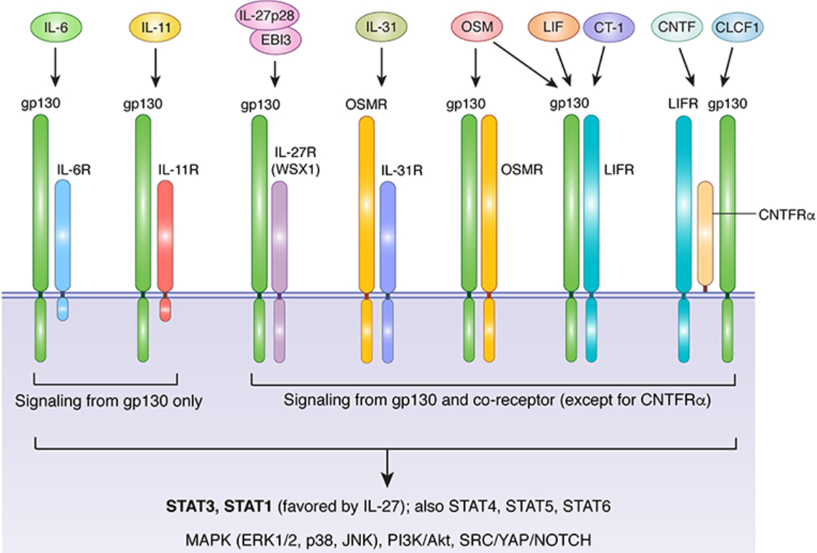 IL11是IL6細(xì)胞因子家族的一種多功能細(xì)胞因子,除IL6外,還包括白血病抑制因子(LIF)、抑癌素M (OSM)、纖毛神經(jīng)營(yíng)養(yǎng)因子(CNTF)、心肌營(yíng)養(yǎng)因子-1 (CT-1)、心肌細(xì)胞因子樣細(xì)胞因子(CLC)、神經(jīng)生成素(NPN/CT-2)、IL-27和IL-31。